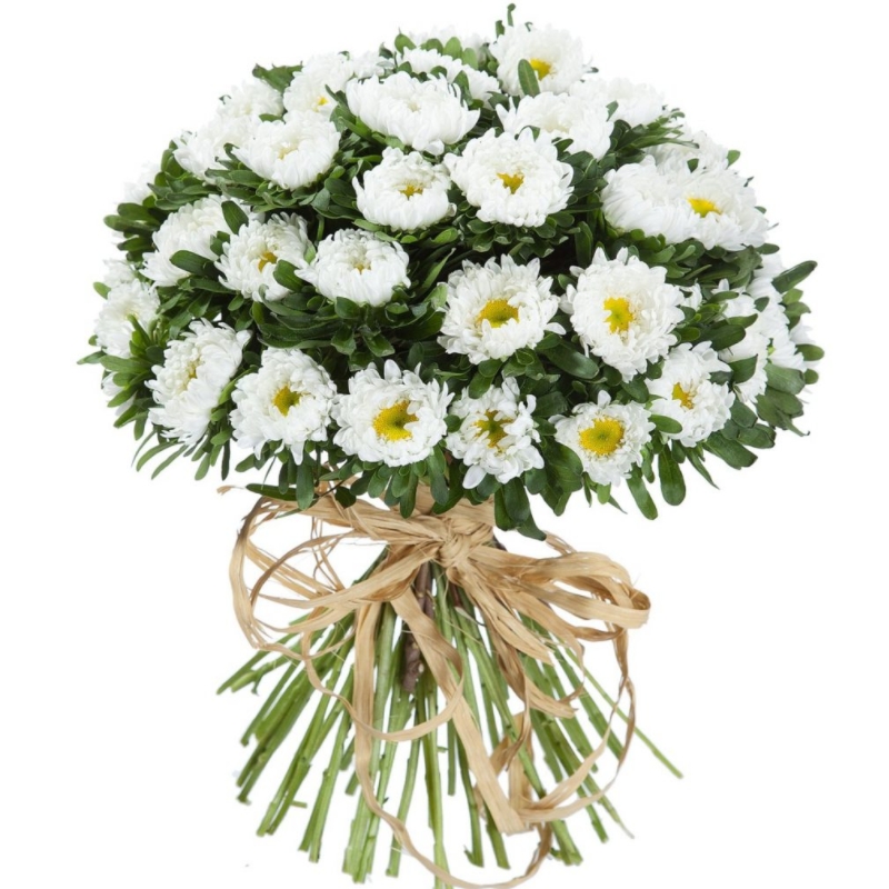Букет состоит из 51 белая астра, прозрачная упаковка, лента.