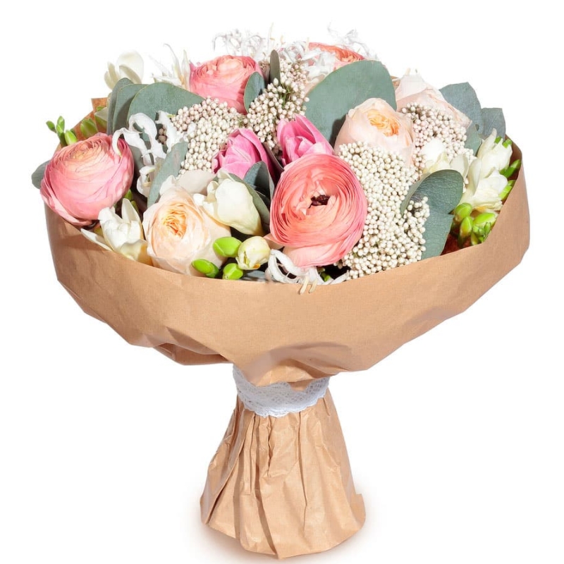 Букет состоит из 4 ранункулюса, 3 пионовидные розы, 7 веток фрезий, 3 цветка озотамнуса, эвкалипт, крафт, атласная лента.
