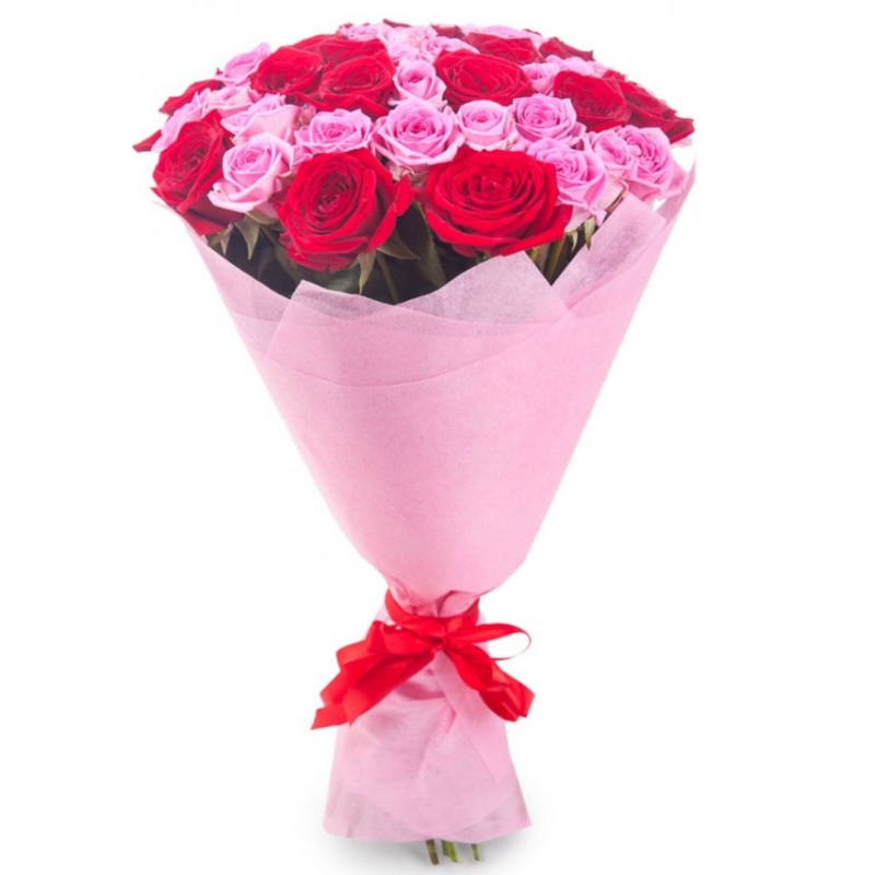 Букет состоит из 23 красные розы, 22 розовые розы, красивая упаковка, атласная лента.